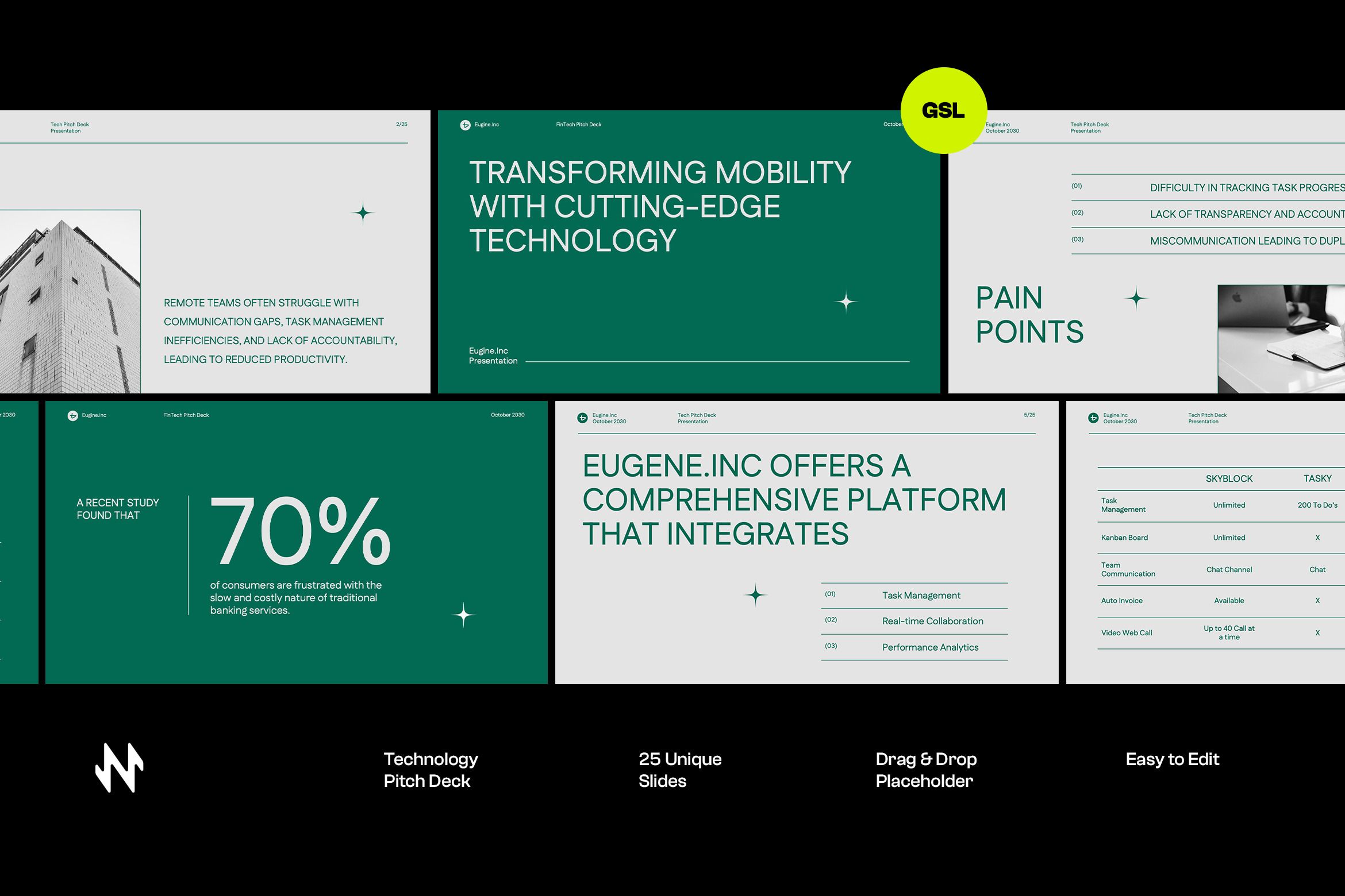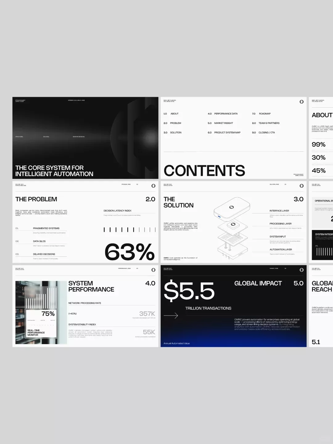 This design features a clean, modern aesthetic utilizing high contrast between dark backgrounds and light text. The visual language is sophisticated and professional, emphasizing clarity and serious enterprise technology concepts.
