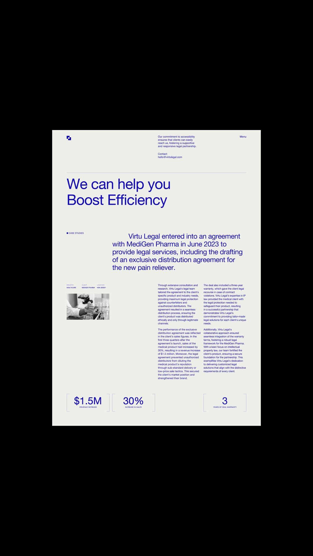 A clean, minimalist B2B marketing document with a professional layout emphasizing efficiency and data-driven results. The design uses ample whitespace, bold typography, and strategic color accents to communicate business value propositions clearly.