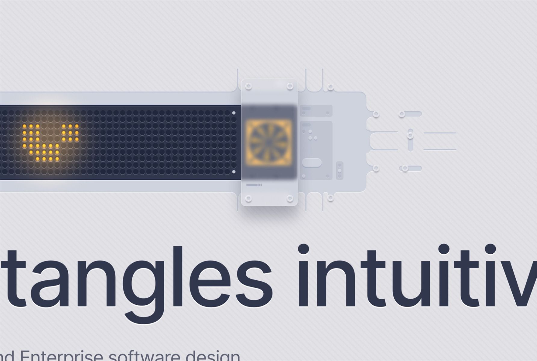 A minimalist tech product showcase featuring a sleek interface design with LED dot-matrix display and translucent UI elements. The composition blends hardware visualization with digital interface aesthetics, emphasizing innovation and precision in enterprise software design.