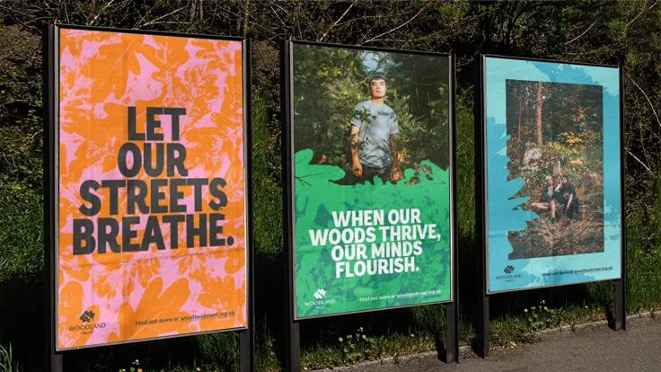 This set of panels uses strong color blocking and organic imagery to convey an environmental message focused on the interdependence of nature and mental well-being. The design employs a clean, modern visual language that balances bold typography with evocative natural photography.