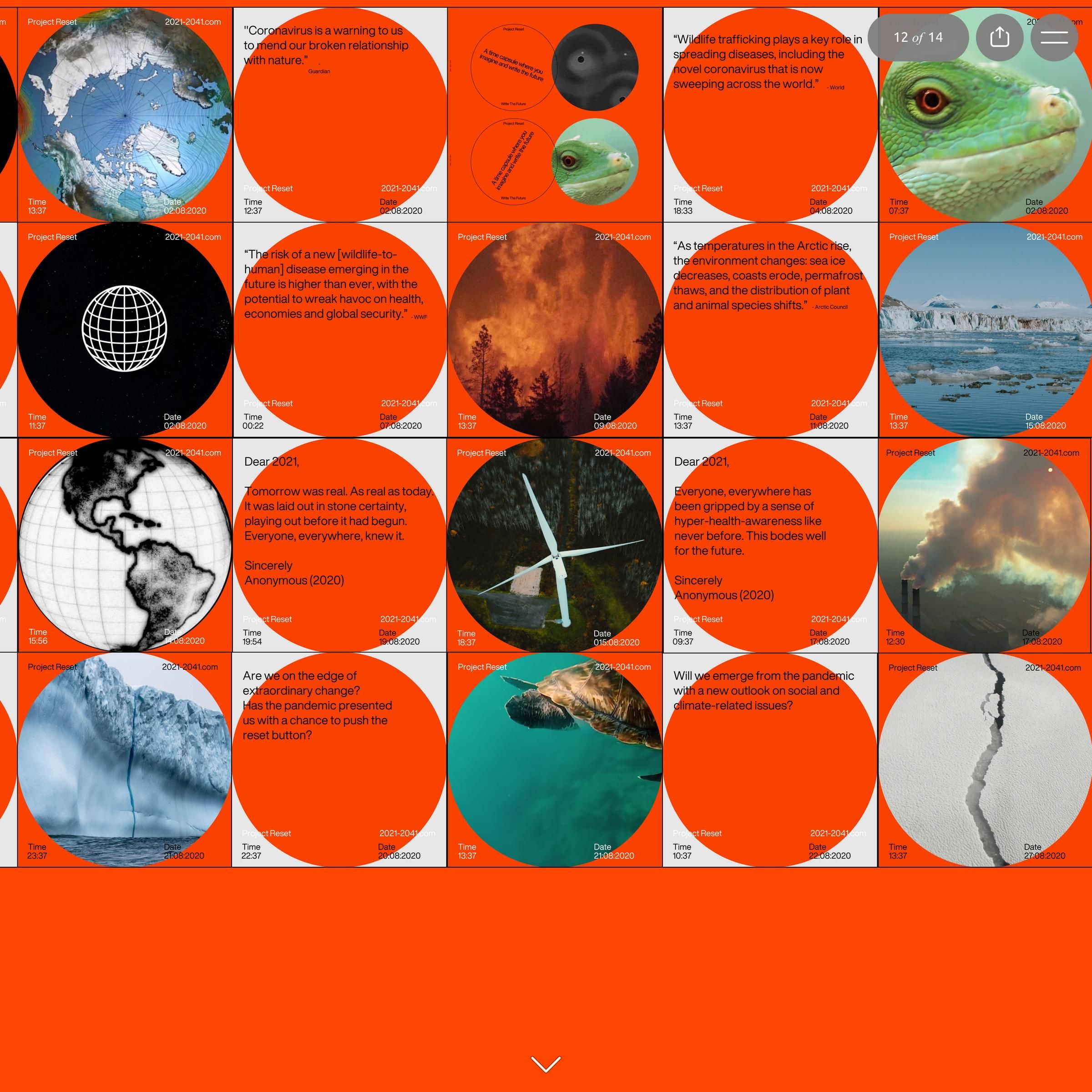 The image presents a highly structured, modular infographic style using a dominant orange background and circular/spherical imagery. The design relies on stark contrast between the vibrant orange and the photographic or graphic elements, suggesting a serious, data-driven, or perhaps scientific/news reporting context.