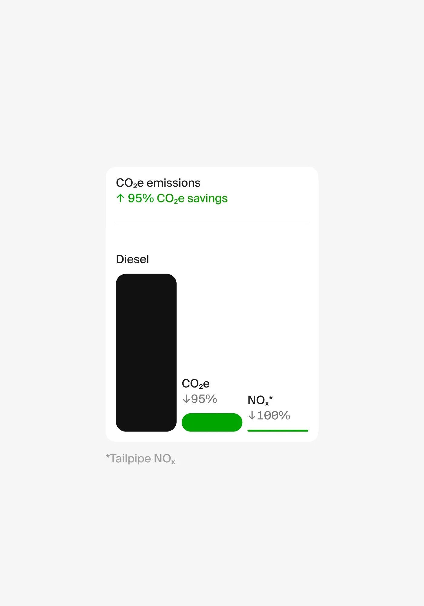 The image presents a minimalist, data-driven infographic style focusing on environmental savings. It uses stark contrast between black and green to visually represent positive outcomes, creating a clean and direct communication of performance metrics.