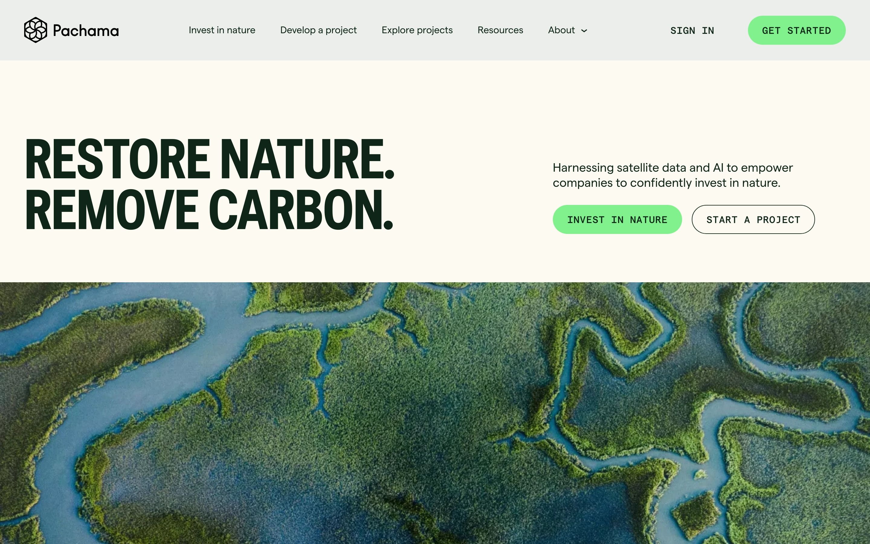 The design is clean, modern, and nature-focused, using a strong juxtaposition between crisp white space for the text and a rich, textured photograph of a natural waterway. The visual language is professional and aspirational, aiming to connect environmental action with investment.