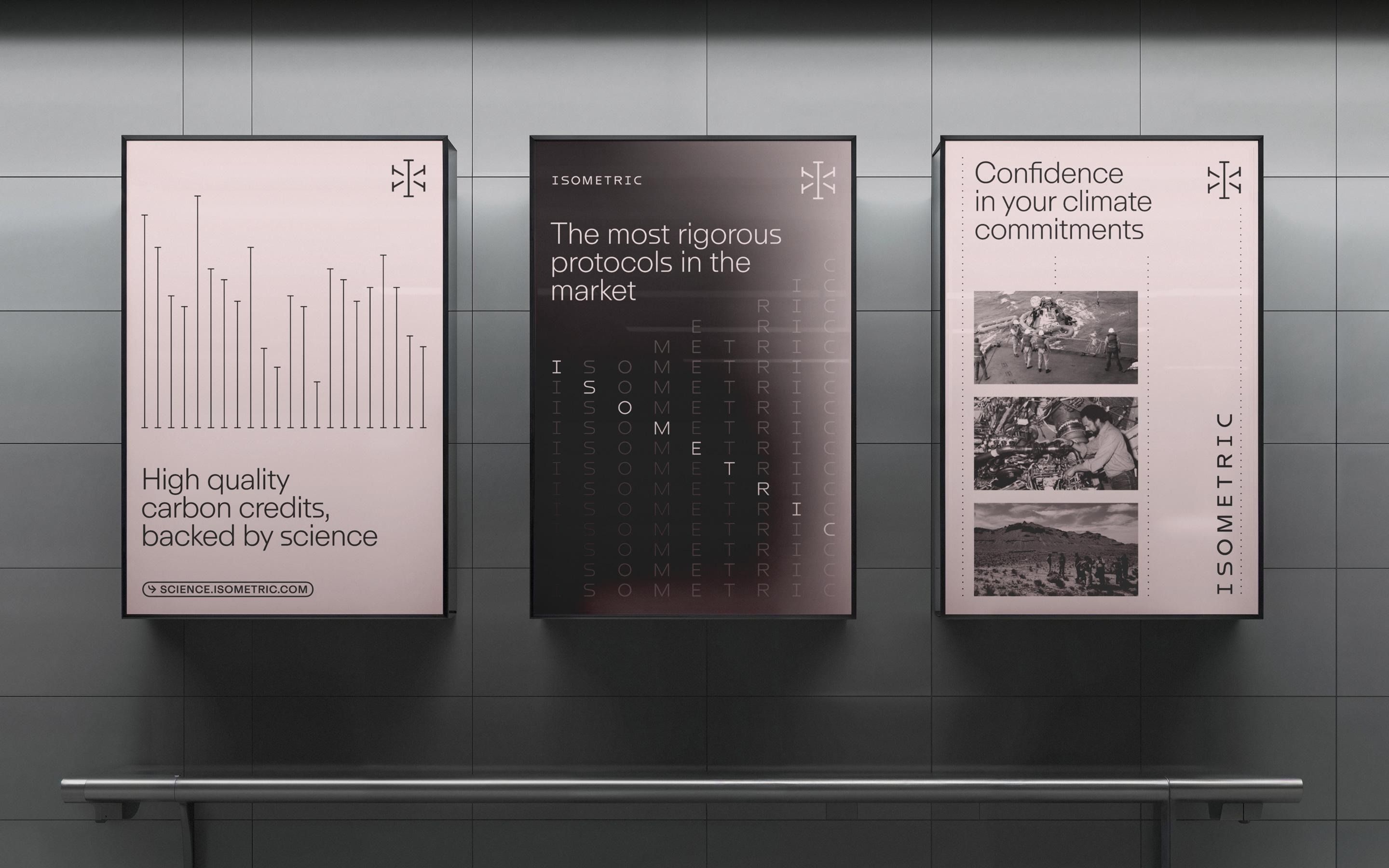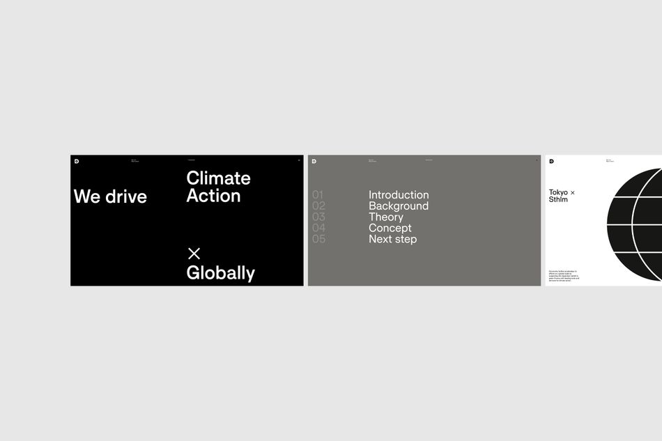 This set of panels utilizes a clean, highly professional design language characterized by strong monochromatic elements and precise data visualization. The visual narrative is structured to convey scientific rigor, trust, and confidence in environmental commitments through minimalist presentation.