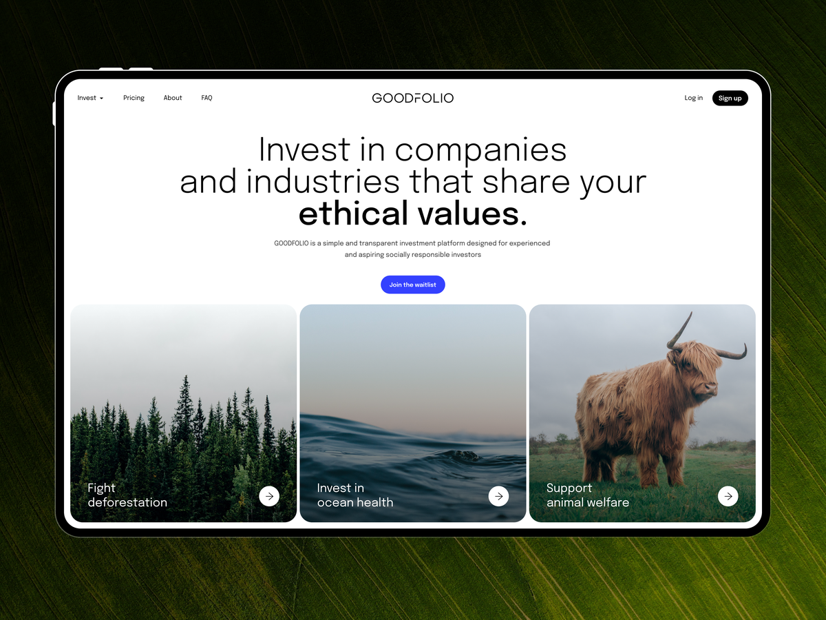 The design is clean, minimalist, and professional, utilizing a muted, natural color palette to convey trust and ethical investment. The layout is spacious, focusing attention on the core message while featuring high-quality, evocative photography.