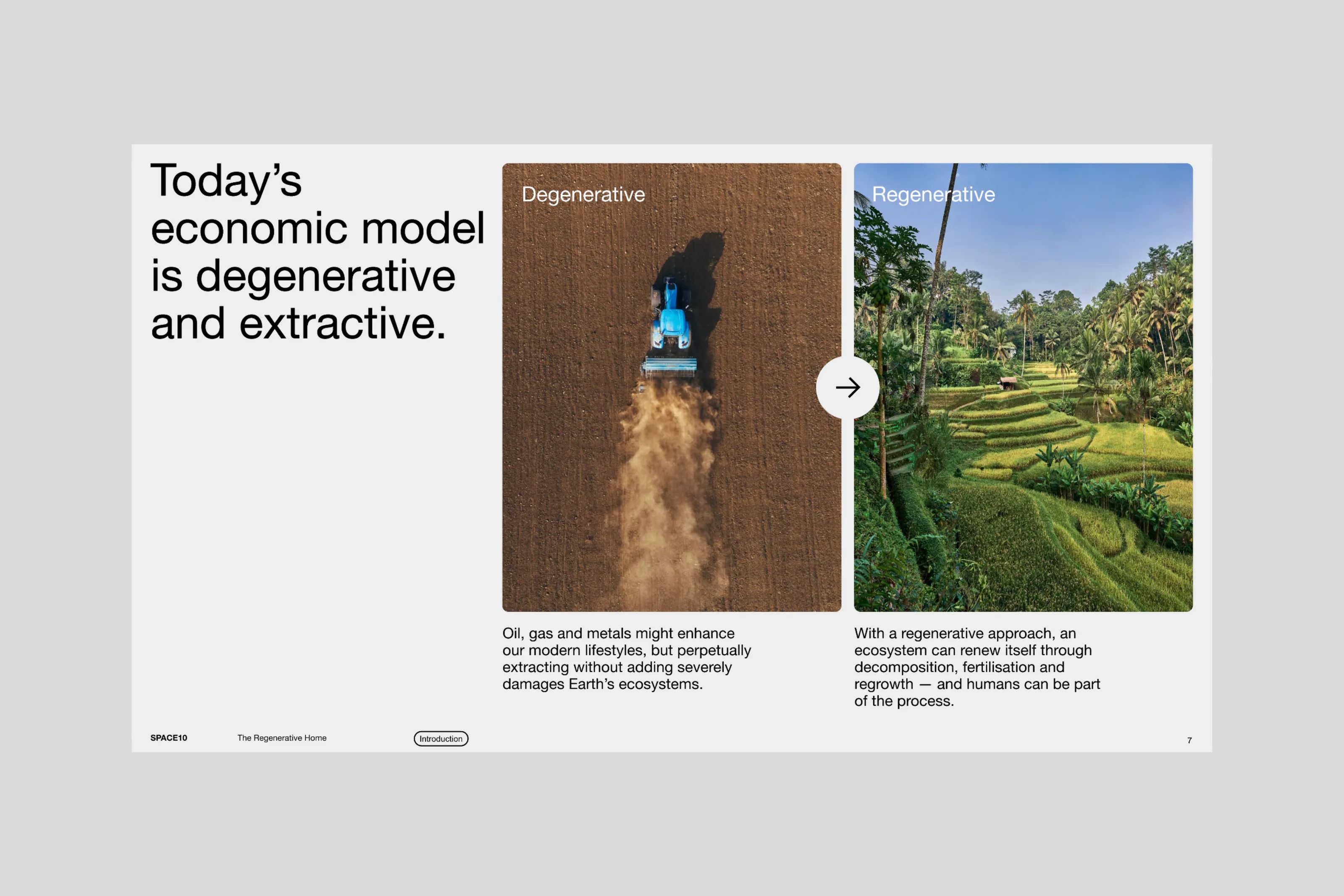 The design utilizes a clear, high-contrast visual dichotomy to juxtapose an extractive and a regenerative economic model. The visual language is clean, educational, and uses natural textures to convey environmental themes effectively.