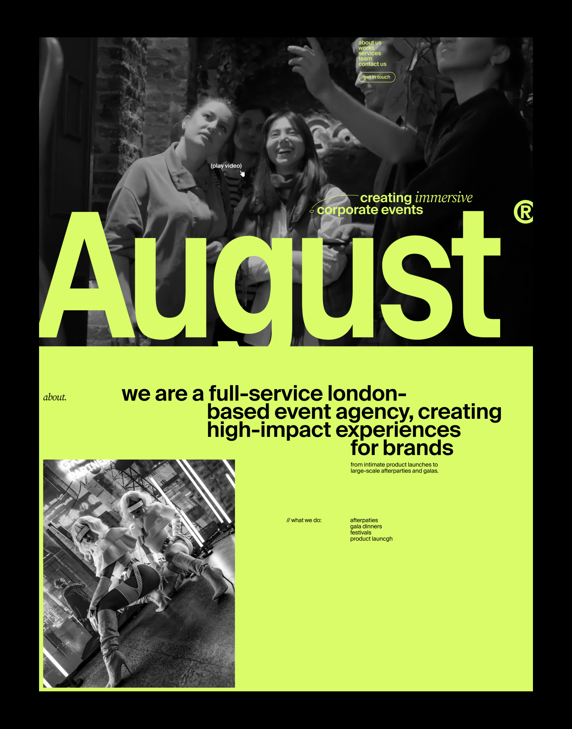 A bold, contemporary design for an event agency featuring high-contrast black and neon yellow typography against dark photography. The layout combines striking sans-serif headlines with candid event imagery, creating an energetic and modern visual identity that emphasizes creative corporate experiences.