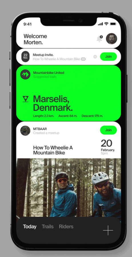 The interface presents a clean, modern mobile application design with a dark mode aesthetic contrasted by vibrant, energetic green accents. The layout is highly structured, using clear cards and ample white space (or dark space) to organize event information effectively.