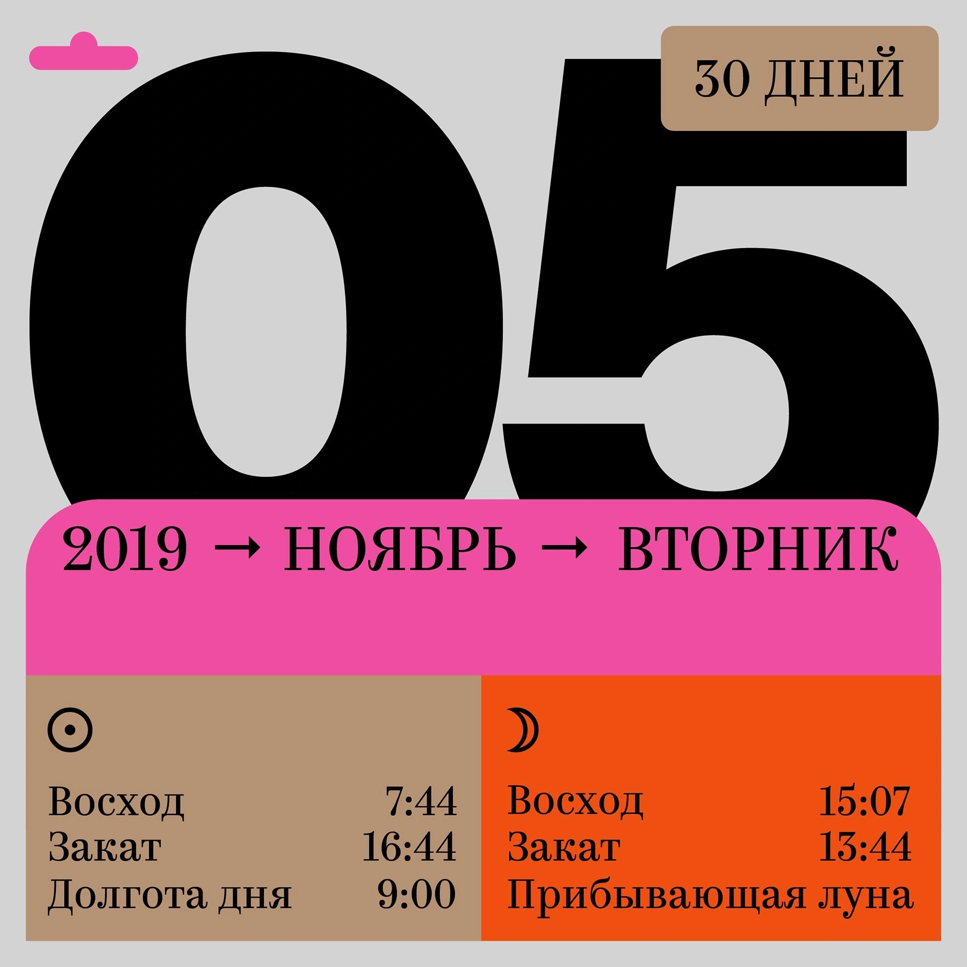 The design is clean, modern, and functional, utilizing a high-contrast palette of black, muted gray, and vibrant pink/orange accents. It effectively uses large, bold numbers to convey a specific date or time context, suggesting an informational or calendrical purpose.