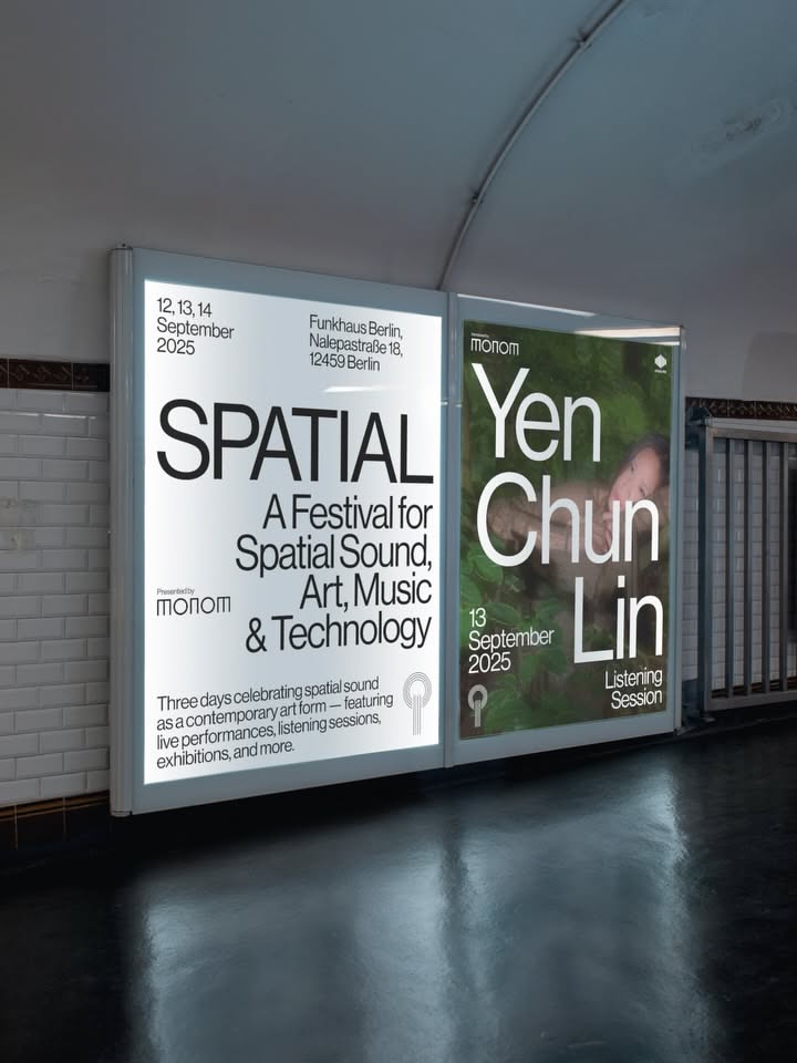 A contemporary gallery installation featuring two illuminated display panels showcasing minimalist typography and event information. The design employs a stark contrast between clean sans-serif text and atmospheric imagery, creating a sophisticated and intellectually engaging visual presentation.