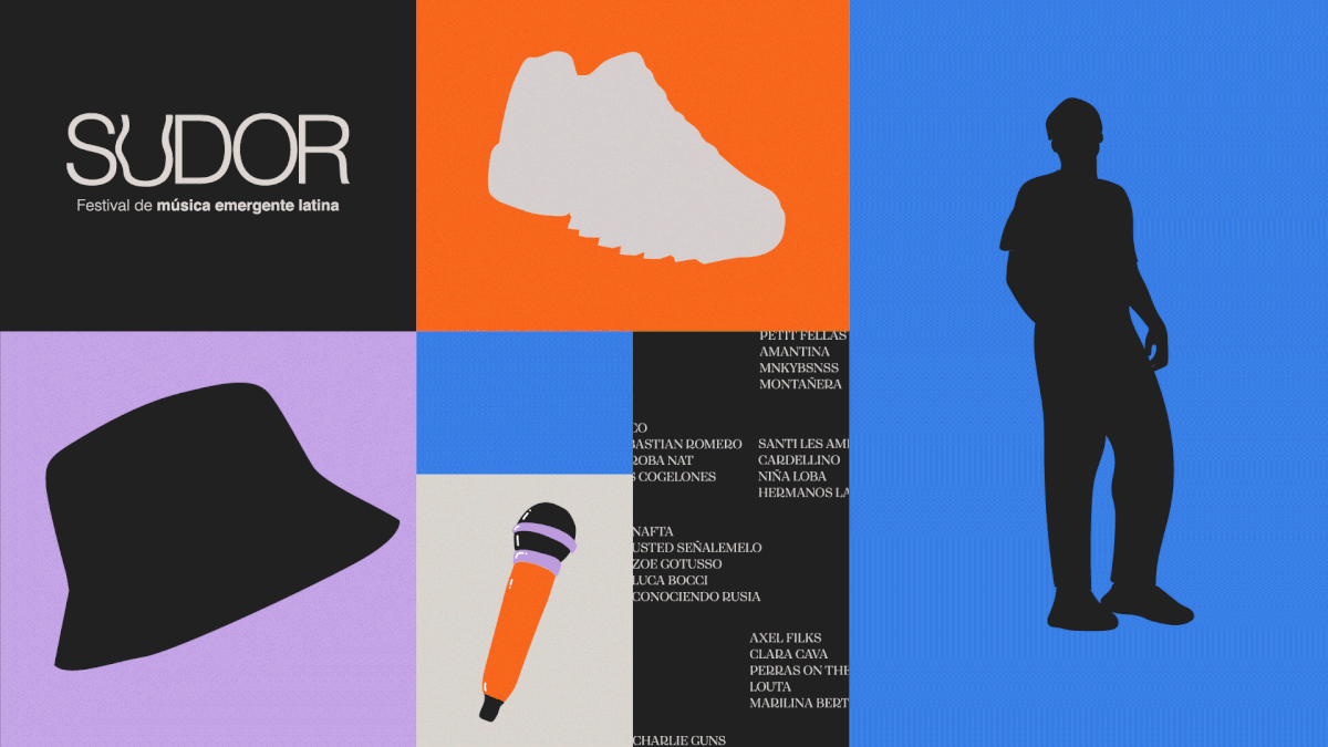 This design employs a bold, modular layout utilizing stark color blocking and strong silhouettes to create a modern, high-contrast aesthetic. The visual language is clean and graphic, effectively separating key information—titles, graphics, and lists—into distinct panels. The overall feel is energetic, contemporary, and suitable for promoting a vibrant music event.