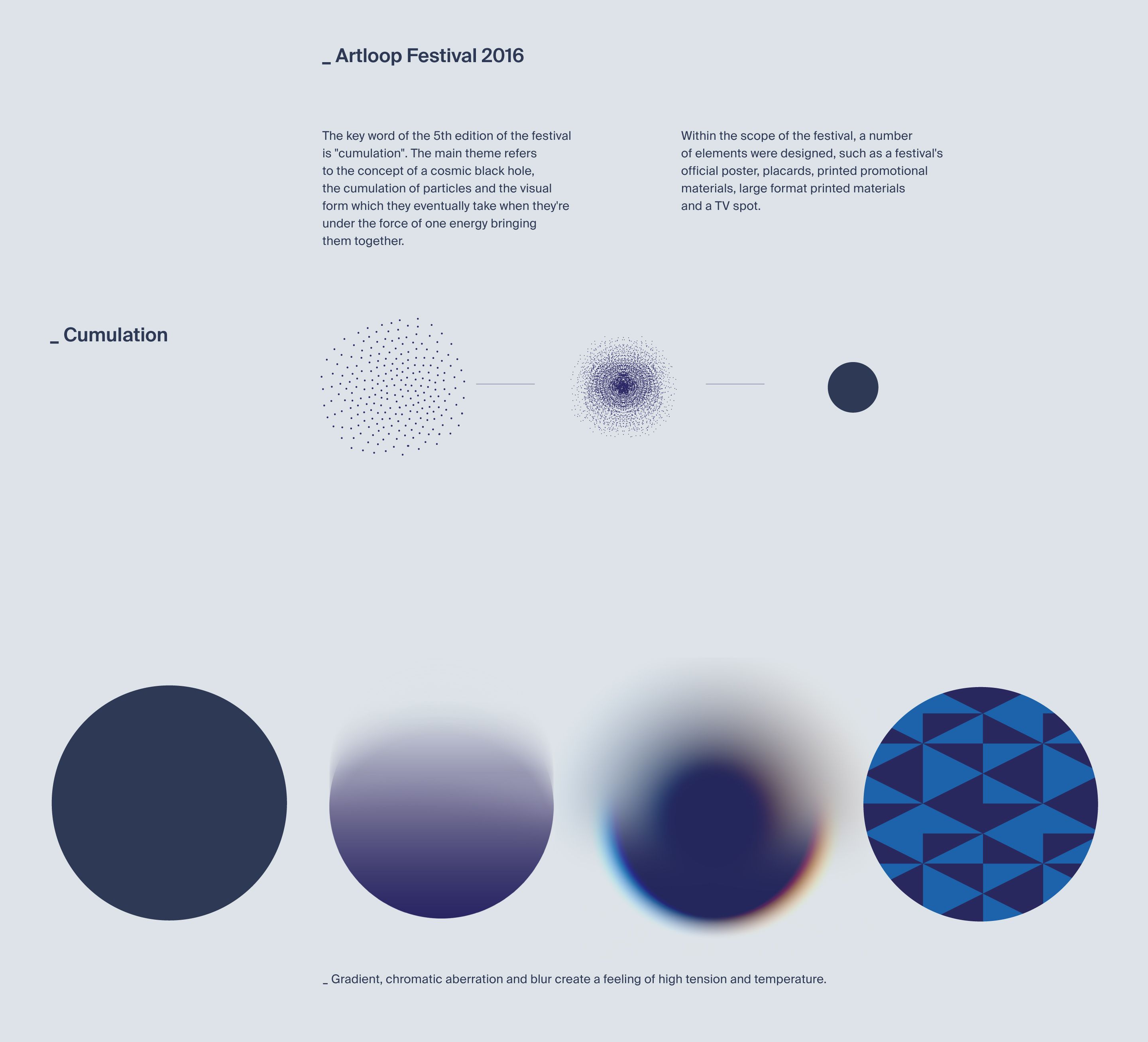 The design is minimalist and conceptual, using subtle gradients and abstract shapes to convey a sense of culmination or energy. It employs a restrained color palette and clean layout to focus attention on the visual progression.