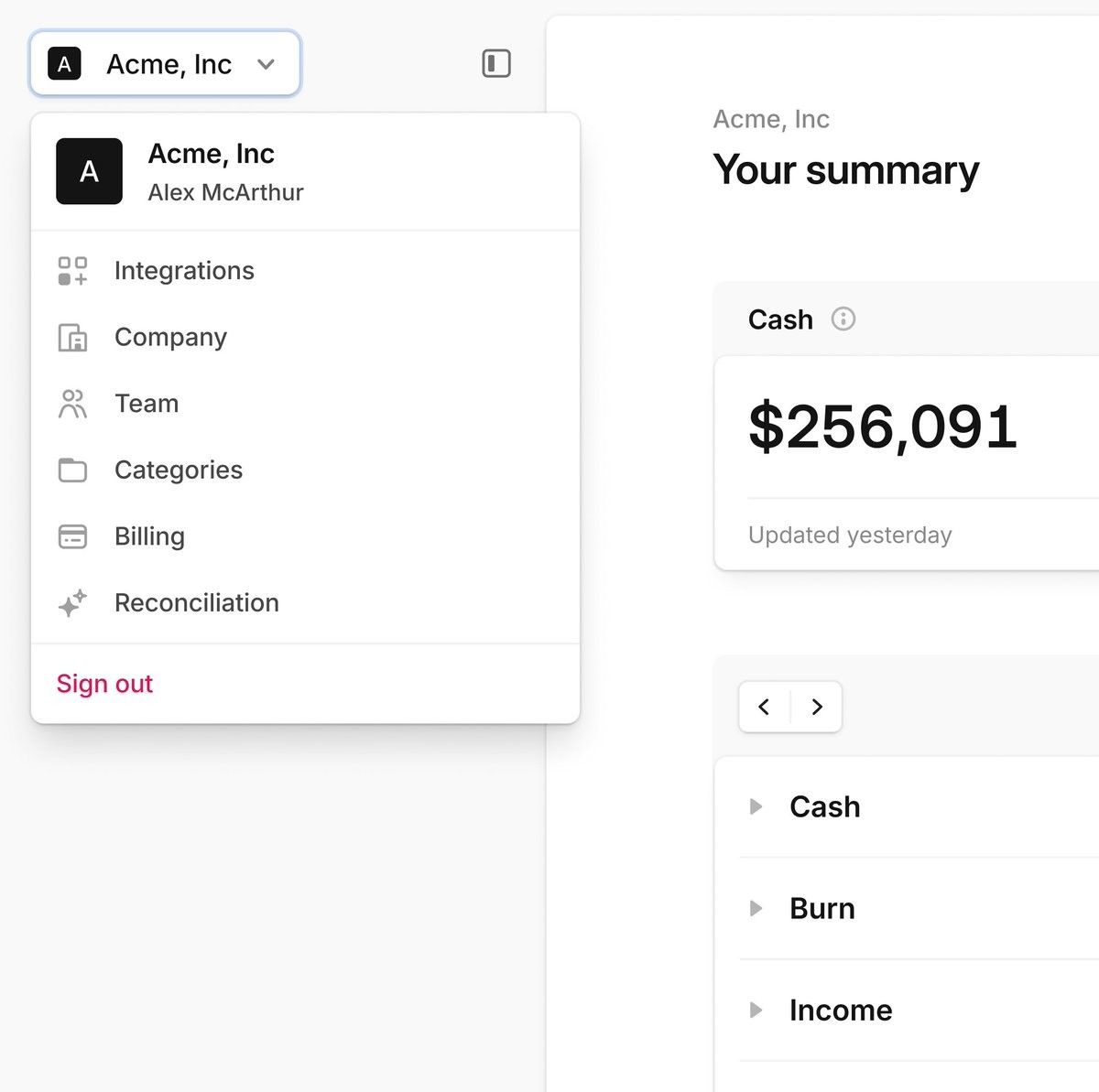 The design features a clean, professional user interface utilizing ample negative space and a clear hierarchical layout to present financial summaries. The visual language is minimalist, emphasizing readability and data clarity through simple typography and structured navigation.