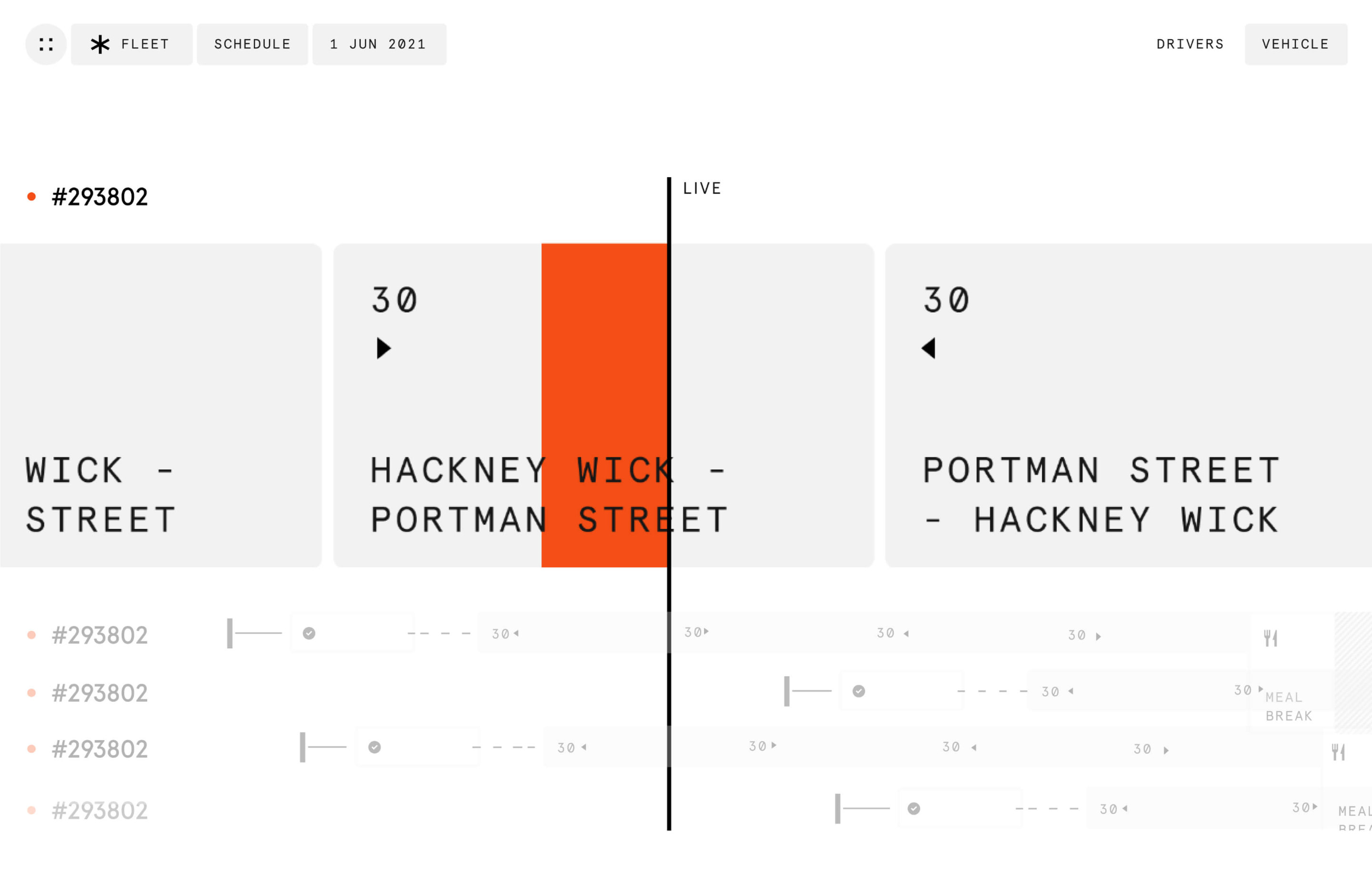 This is a highly functional, data-driven schematic design characterized by clear segmentation and linear progression. The visual language is minimalist and technical, prioritizing information hierarchy and spatial relationships above all else to convey route or schedule data effectively.