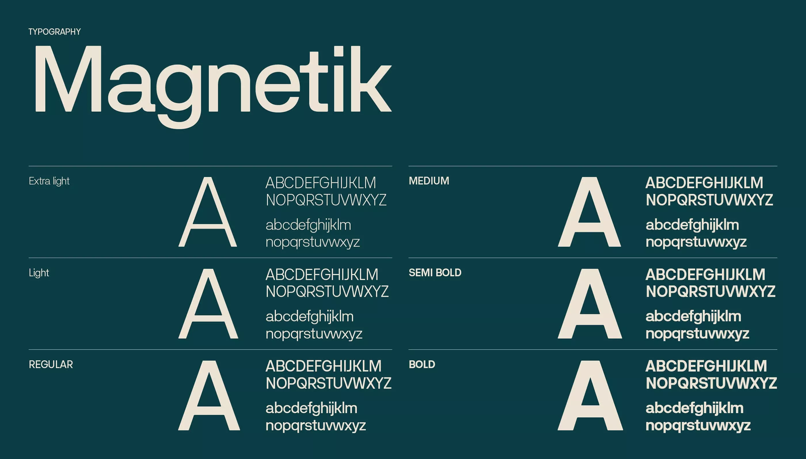 This image presents a clean, minimalist display of various font weights and styles for a typeface named 'Magnetik'. The design relies heavily on negative space and a monochromatic, muted color scheme to emphasize the typographic variations.