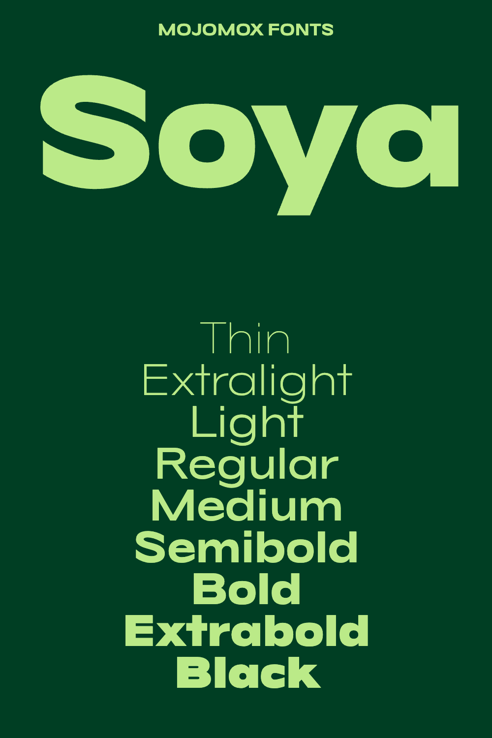 This is a clean, minimalist display of a typeface named 'Soya' set against a deep, muted green background. The design emphasizes the hierarchy and range of weights available in the font family through clear, stacked text.