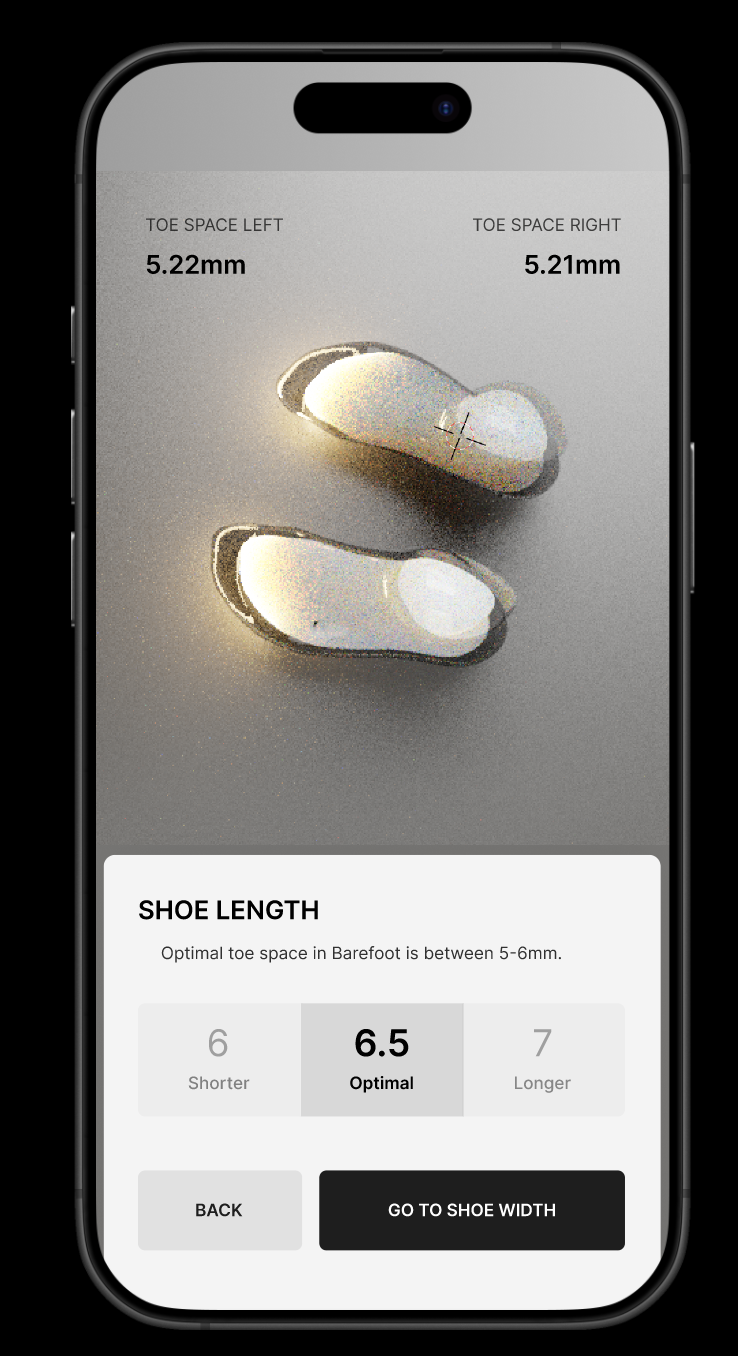 This image presents a clean, minimalist user interface design focused on providing precise measurements for footwear sizing. The visual language is clinical and direct, using high contrast and ample negative space to emphasize the key data points.