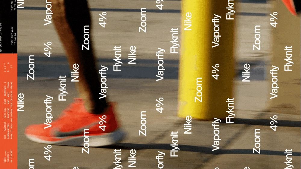 This image is a dense typographic collage featuring athletic branding and technical terms overlaid on a blurred background, likely related to footwear technology. The visual language is highly informational and branded, emphasizing product features through scattered text elements.