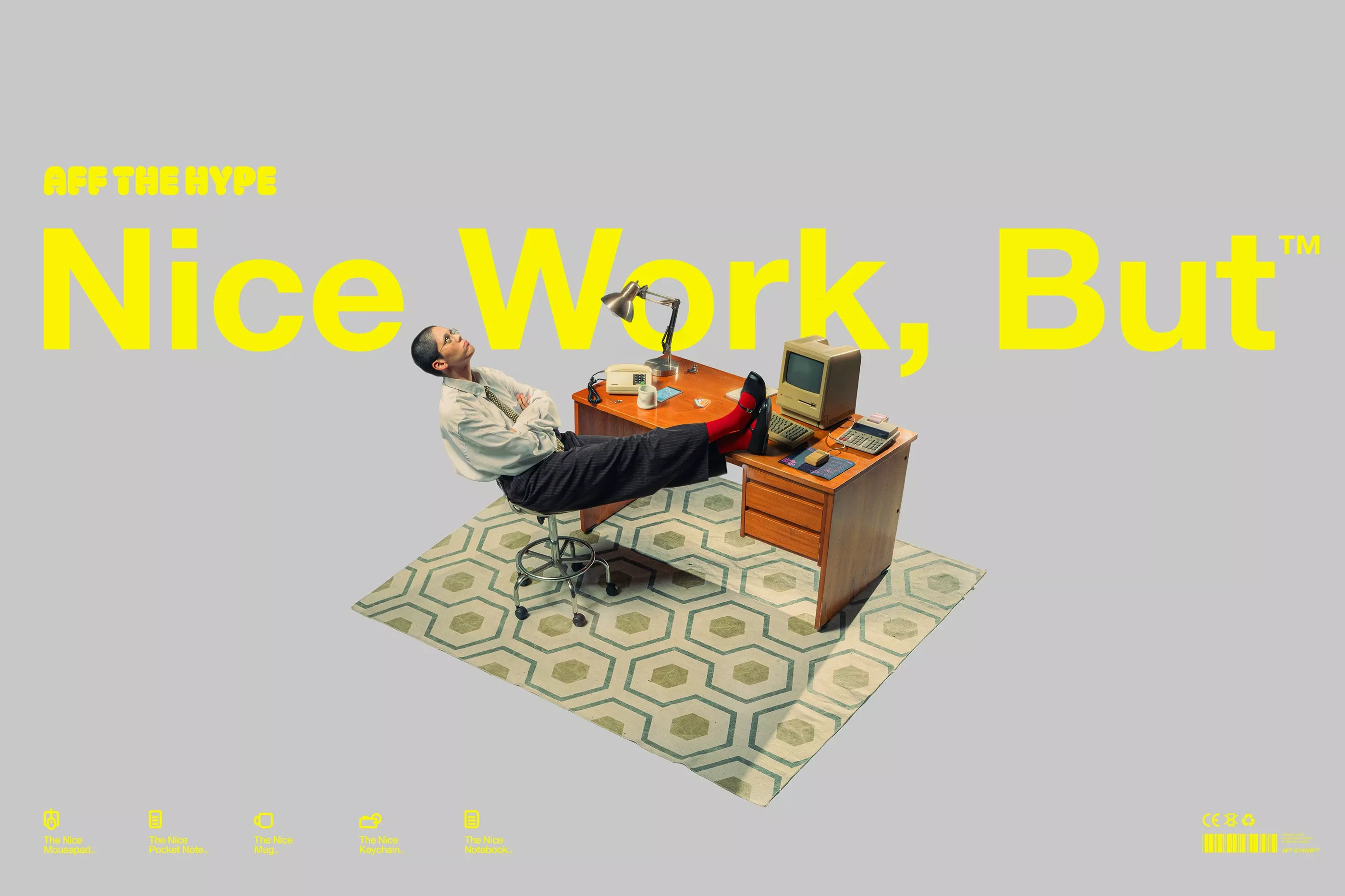 This image employs a minimalist yet staged approach, pairing the relaxed pose of the subject with structured professional elements like a desk and laptop. The visual language relies on muted tones and clean lines to create a calm, yet slightly ironic atmosphere regarding productivity.