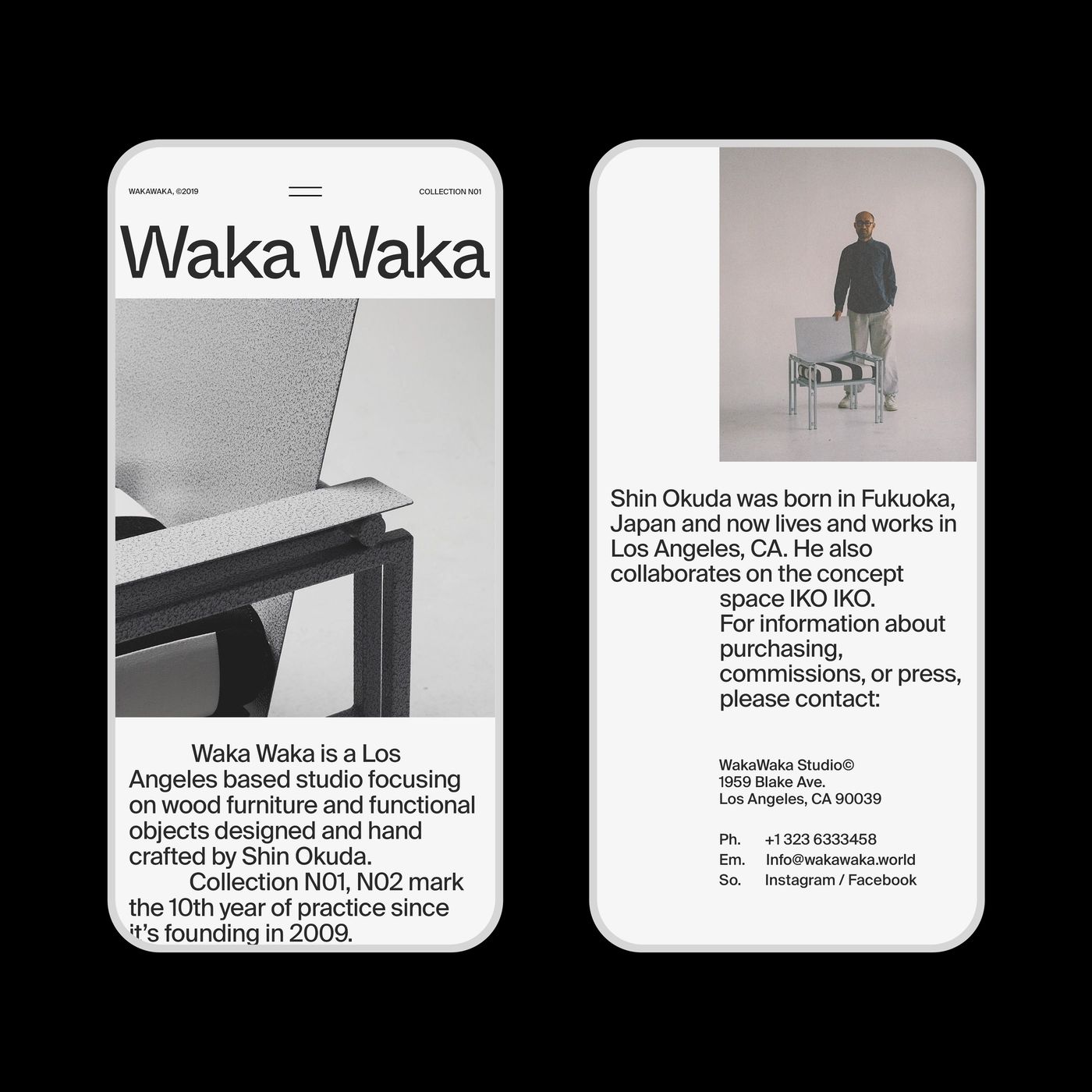 A minimalist portfolio presentation for Waka Waka, a Los Angeles-based furniture design studio. The design employs a clean, contemporary aesthetic with generous whitespace, monochromatic imagery, and sans-serif typography that emphasizes clarity and sophistication.