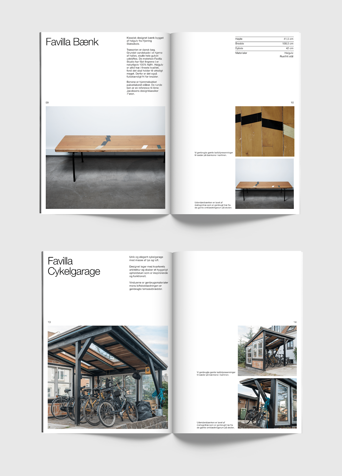 A minimalist architectural portfolio or branding document featuring clean layouts with generous whitespace and high-quality photography. The design showcases Scandinavian-influenced modernism with a focus on functional furniture and architectural structures, presented through a sophisticated editorial approach.