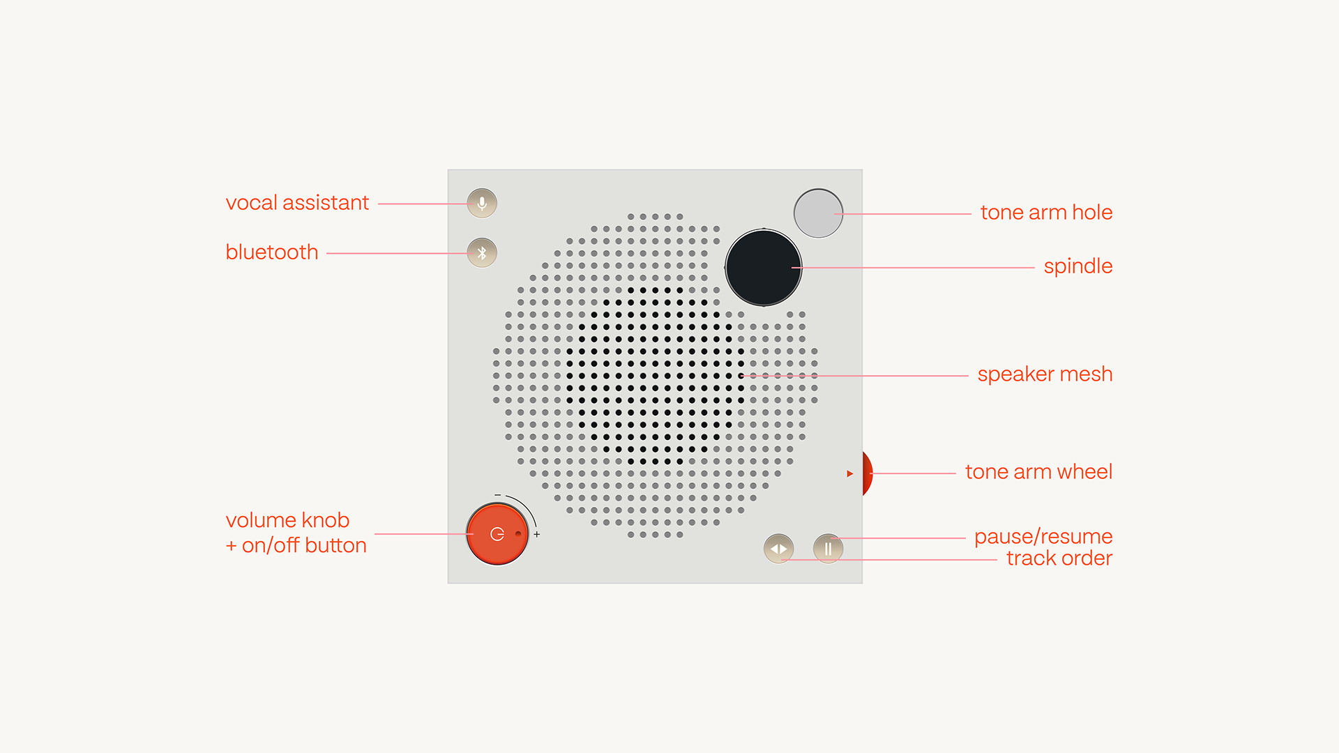 The image presents a clean, technical diagram illustrating the components of an electronic device, likely a musical instrument or small gadget. The visual language is minimalist and functional, using simple line drawings to map out physical features clearly. It conveys a sense of detailed engineering and user interface mapping.
