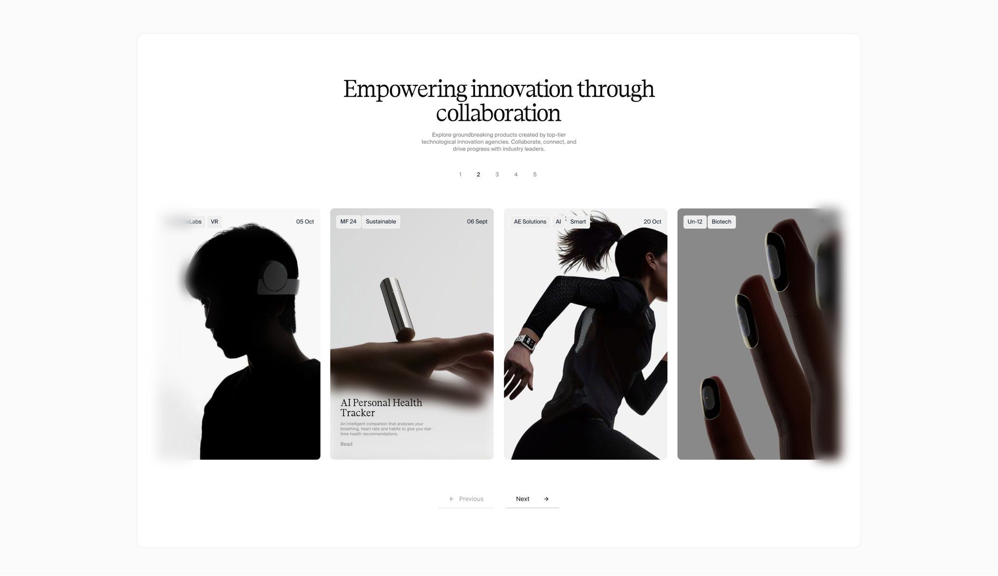 The design presents a clean, minimalist layout focused on a concept titled 'Empowering innovation through collaboration.' It uses high-contrast photography and ample negative space to convey a modern, professional, and forward-thinking tone.