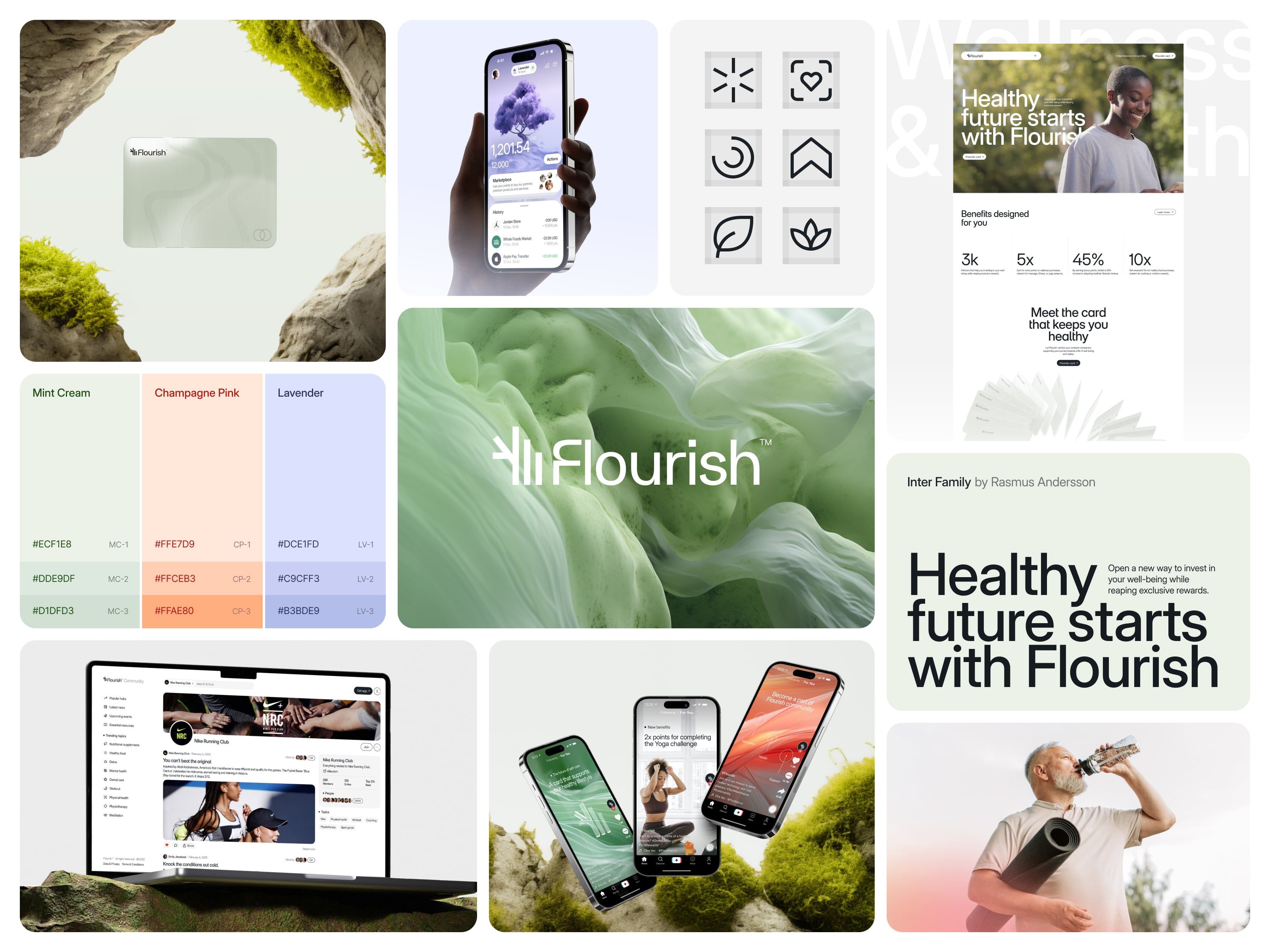 This visual research collage showcases a cohesive brand identity centered around health, wellness, and modern digital interfaces. The design blends organic textures with clean, vibrant UI elements, creating a refreshing and sophisticated feel suitable for a health-focused application or service.