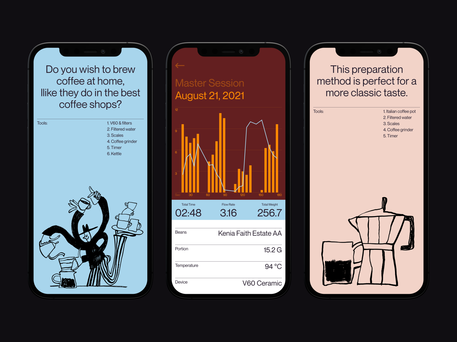 The image presents a clean, modern mobile app interface design focused on brewing coffee. It uses a minimalist aesthetic with clear data visualization (bar charts) and simple iconography, conveying a professional yet accessible user experience.