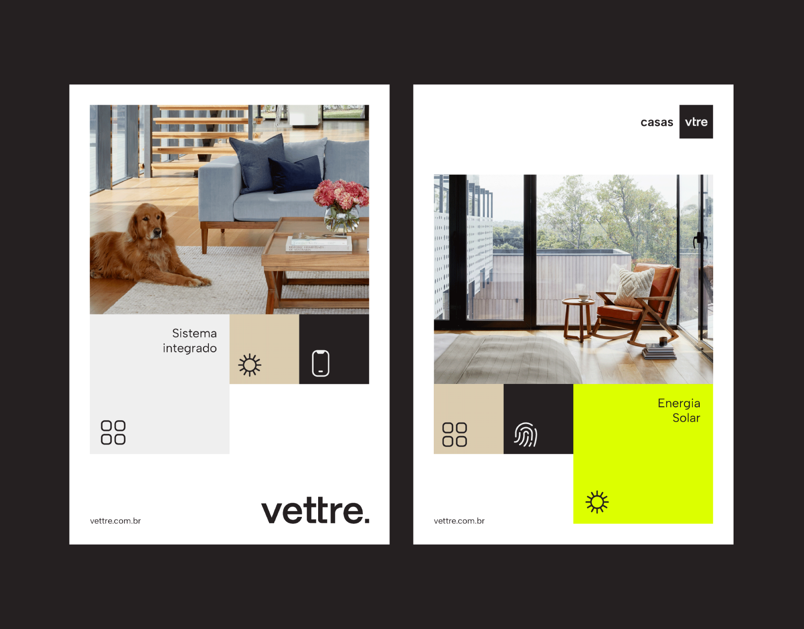 This design employs a clean, modern aesthetic with high contrast between dark neutrals and vibrant accents. The visual language balances lifestyle imagery (natural light, interior design) with clear technical information, creating a trustworthy and sophisticated feel.