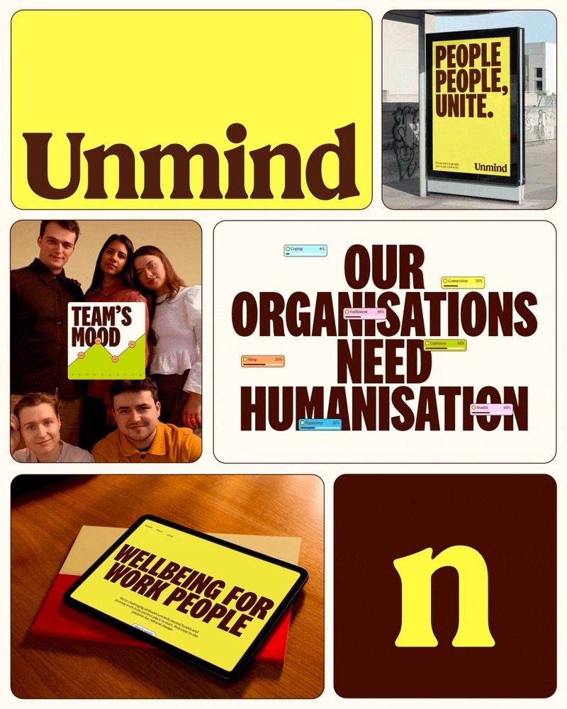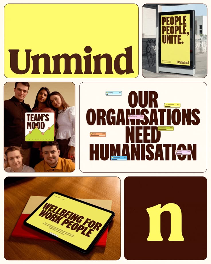 This design utilizes a high-contrast, minimalist approach dominated by bright yellow and stark black typography to convey positivity and corporate trust. The visual language is clean, direct, and optimistic, effectively communicating a commitment to employee welfare and development.