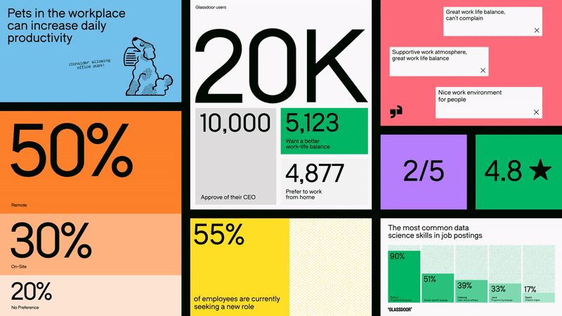 This is a dense, modular data infographic that utilizes bold typography and vibrant color blocking to present statistics and qualitative feedback. The design is clean and analytical, effectively breaking down complex information into digestible visual chunks suitable for corporate or HR reports.