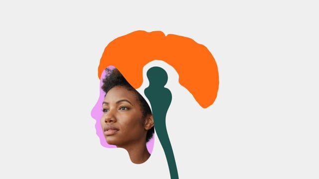 This is a graphic representation featuring the silhouette of a person overlaid with an abstract, organic shape in a vibrant orange hue. The design uses bold, simplified forms to suggest concepts like identity, growth, or abstract presence.