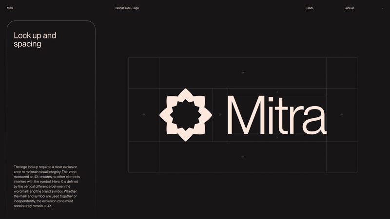 This is a highly structured, minimalist design presentation emphasizing precision and visual rules for branding. The layout uses a stark dark background contrasted with light elements to create a sophisticated and professional identity.