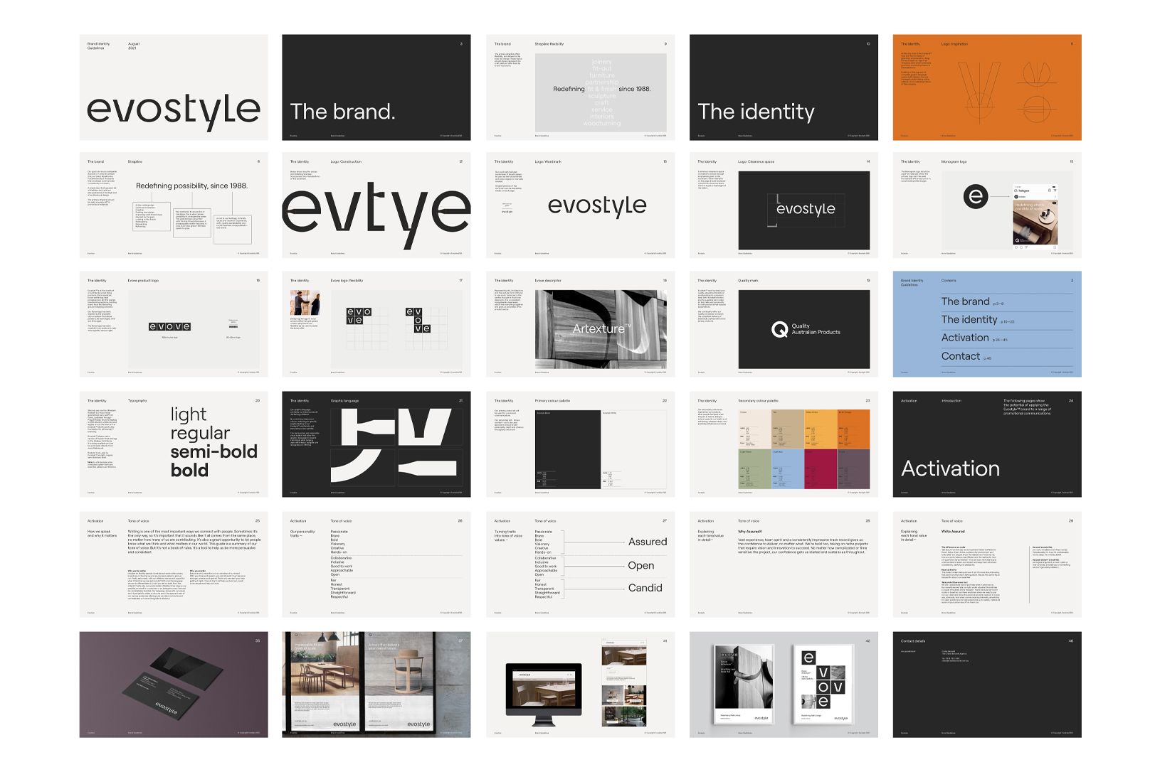 This image presents a highly organized grid of professional design mockups, emphasizing clean typography, strong contrast, and modular layout for brand identity presentation. The visual language is minimalist and corporate, focusing on clarity and sophisticated structure.