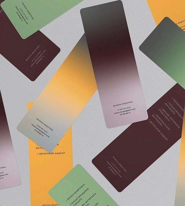 This design showcases a clean, modern approach to visual identity using a muted color palette and geometric shapes. The cards are layered and color-coded to create distinct yet cohesive information blocks, resulting in a sophisticated and organized aesthetic.