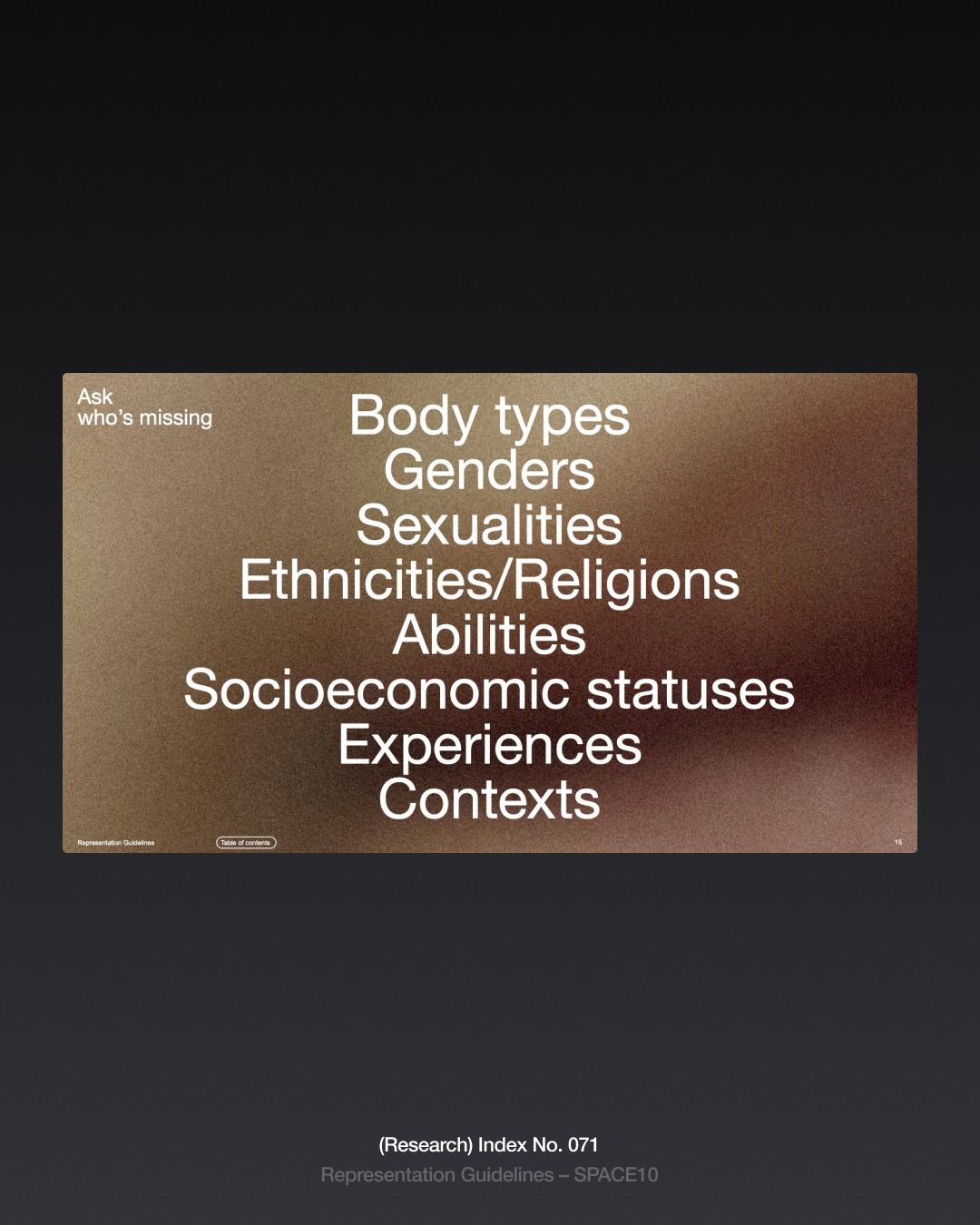 The image presents a stark, minimalist design using a muted, earthy tone to list various categories of identity and experience. The layout is clean and centered, relying heavily on negative space to draw attention to the text hierarchy.