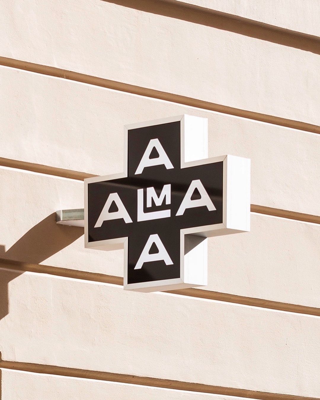 This design utilizes strong geometric forms and high contrast to create a clean, modern visual statement. The interplay between the raised black lettering and the surrounding white frame provides significant depth and tactile interest against the muted background. The overall aesthetic is precise, architectural, and minimalist.