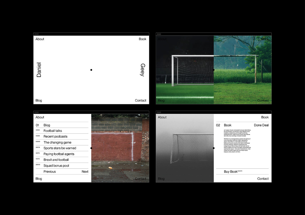 A minimalist design system showcasing a sports/football brand with clean typography and documentary-style photography. The layout demonstrates a modular grid system with high contrast between white space and dark elements, emphasizing content hierarchy and functional elegance.
