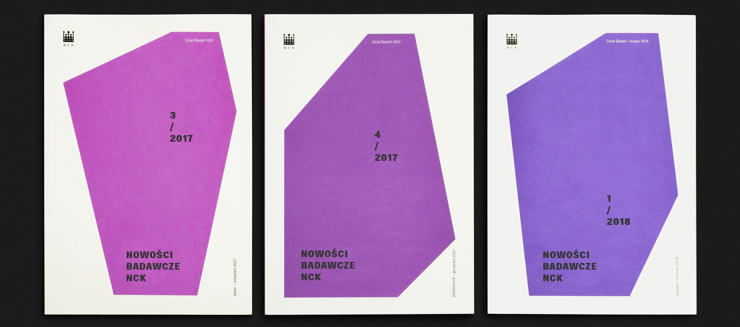 This set of designs demonstrates a clean, modern visual language characterized by strong geometric shapes and a limited, sophisticated color palette. The consistent use of angular forms provides a strong brand identity while maintaining ample negative space for clear information hierarchy.