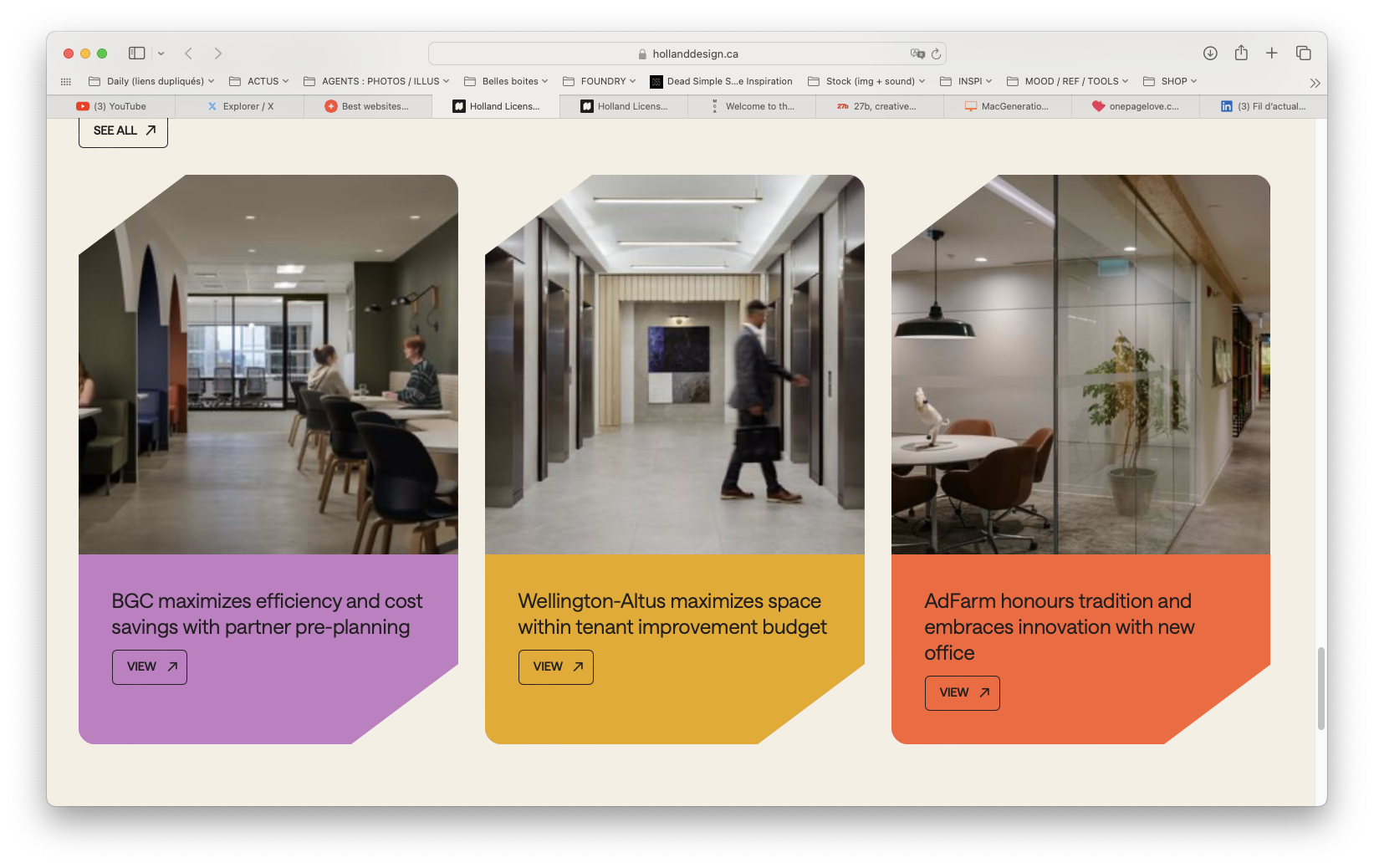 The visual theme combines professional corporate imagery with clean, modern interior design concepts. The layout is structured using distinct cards to showcase specialized services in a sophisticated and accessible manner, emphasizing clarity and spatial solutions.