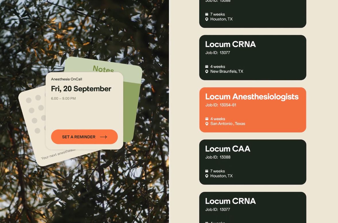 The image presents a clean, professional interface design, likely for scheduling or job listings, characterized by a muted, earthy color palette and clear, card-based layout. The visual language is minimalist and functional, prioritizing readability and clear delineation between different information blocks.