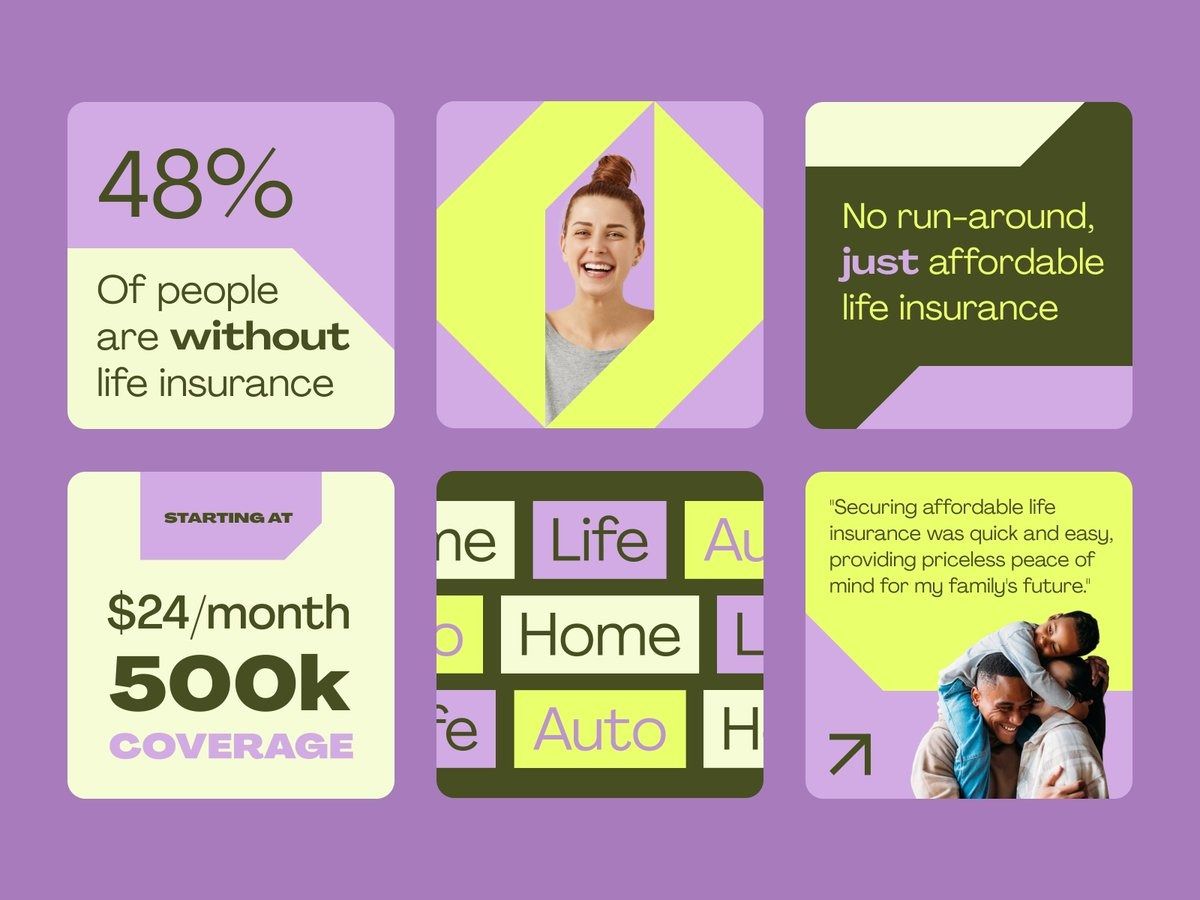 The image uses a clean, modern, and pastel-toned design with distinct geometric shapes to present insurance statistics and coverage details. The visual language is straightforward, relying on bright accents against muted backgrounds to convey trust and clarity.