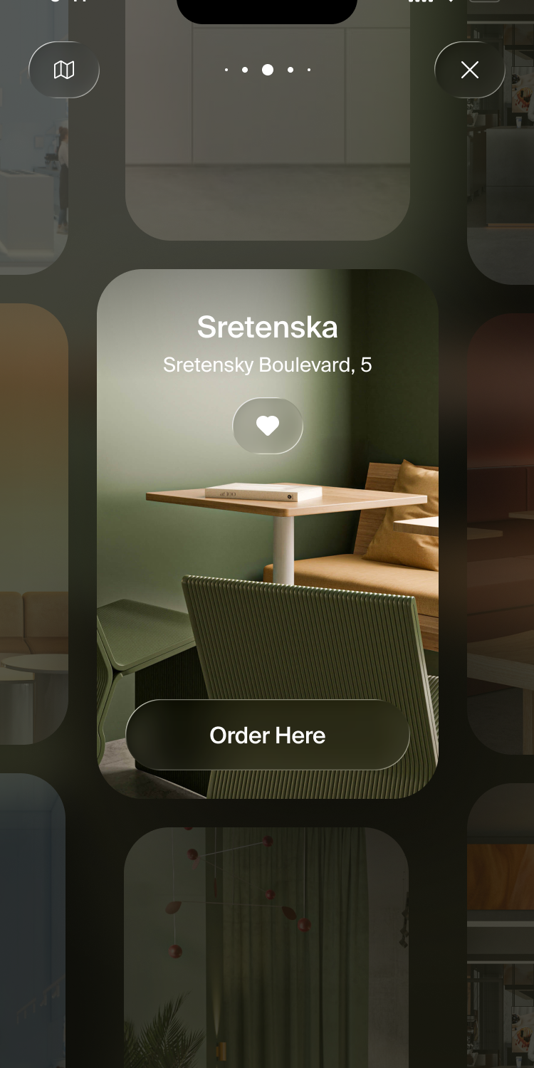 A mobile app interface showcasing a restaurant or venue location card with a minimalist aesthetic. The design features a soft, muted color palette with warm wood tones and sage green accents, presenting a sophisticated and contemporary dining experience. The layout emphasizes clean typography and a prominent call-to-action button.