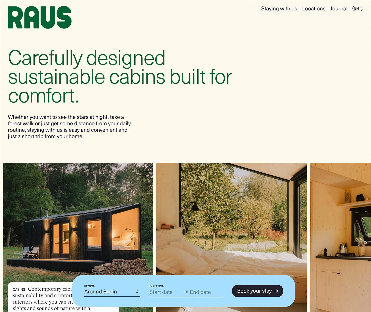 The image presents a clean, modern aesthetic focused on sustainable, minimalist cabin design. The visual language emphasizes natural light, integration with the surrounding landscape, and a sense of cozy, yet sophisticated, retreat.