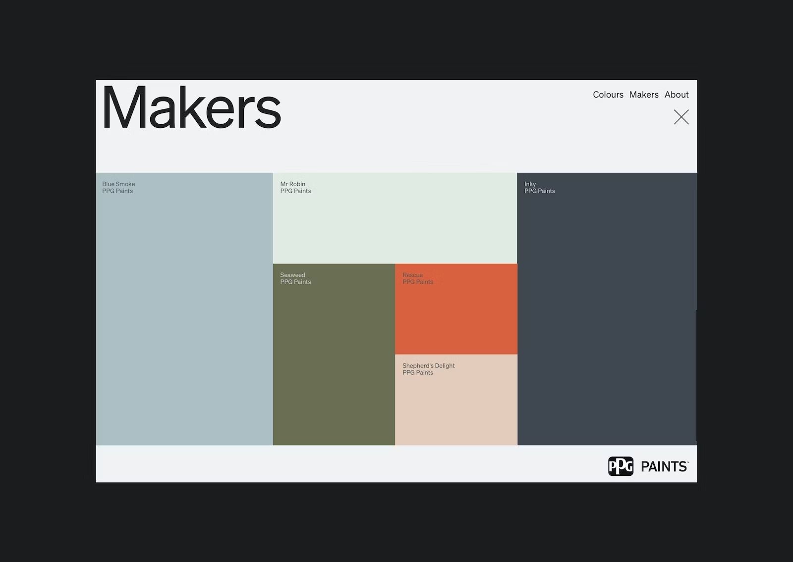 This design presents a highly organized and minimalist interface focused on presenting color swatches in a grid format. The visual language is clean and corporate, prioritizing clarity and the distinct differentiation of various paint shades.