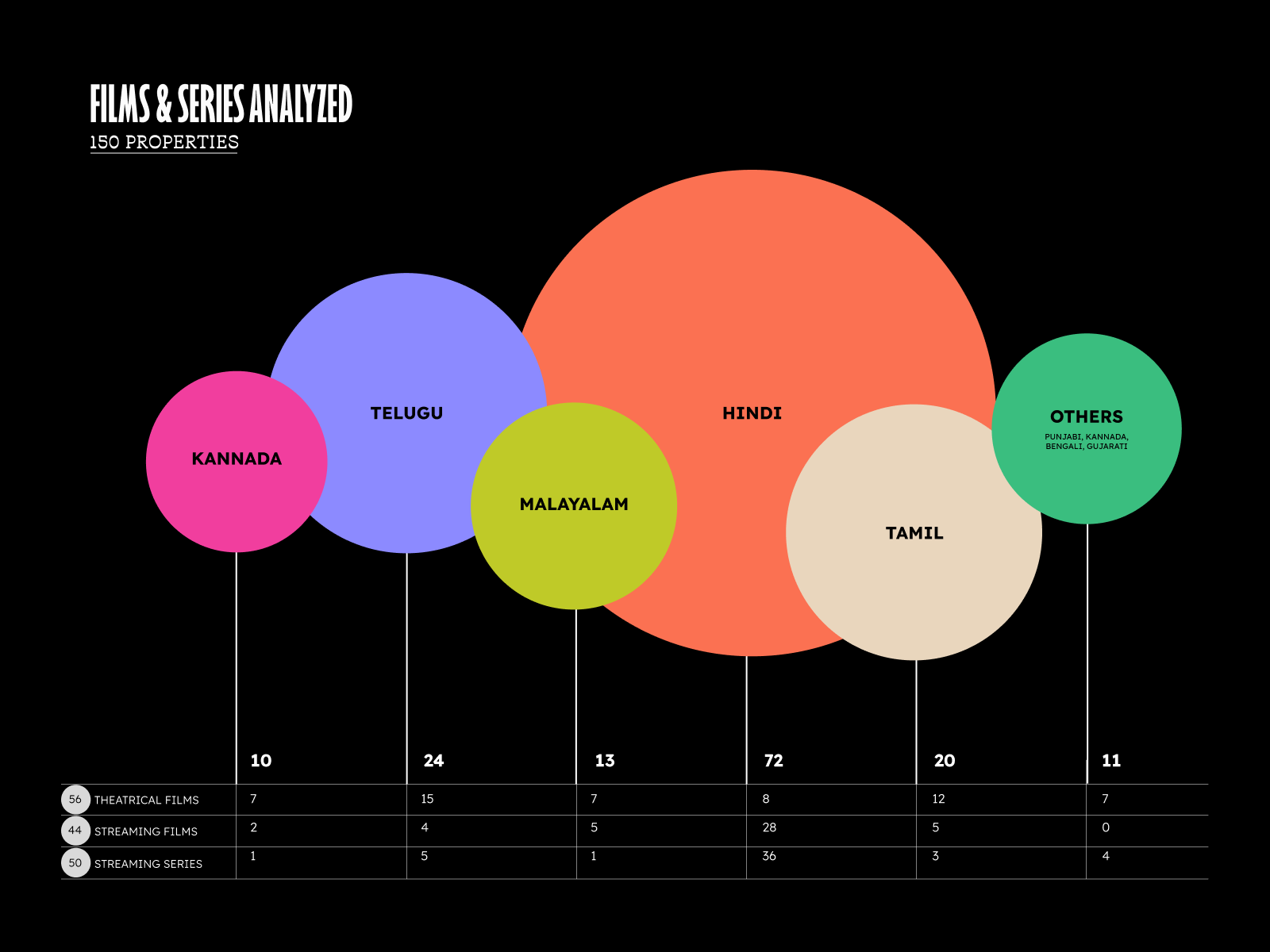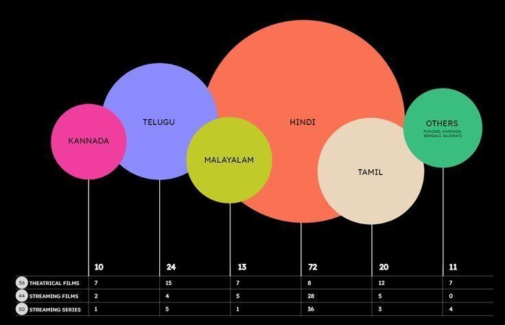 The image is a data visualization presenting film and series properties, utilizing a vibrant, circular infographic style against a stark black background. The design is clean and modern, effectively uses color coding to differentiate categories, suggesting a focus on regional film industry statistics.