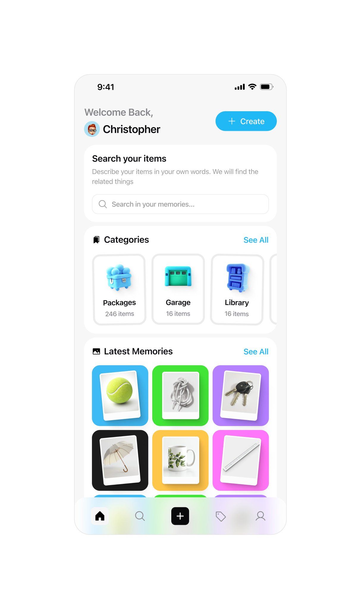The image displays a clean, modern user interface for a memory or photo management application, characterized by ample white space and clear iconography. The design employs a light, minimalist aesthetic typical of contemporary mobile apps, focusing on intuitive navigation through categorized items.