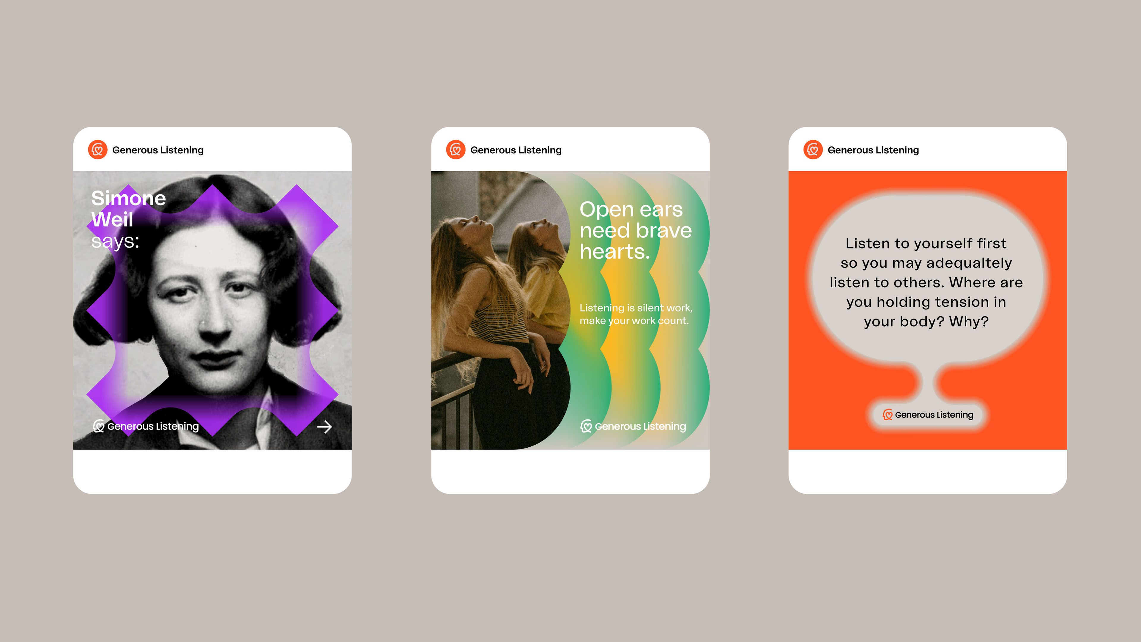 The image displays three distinct mobile screen mockups, likely representing user interface designs for a listening or communication app. The design uses soft gradients and clear imagery to convey a sense of empathy and openness.