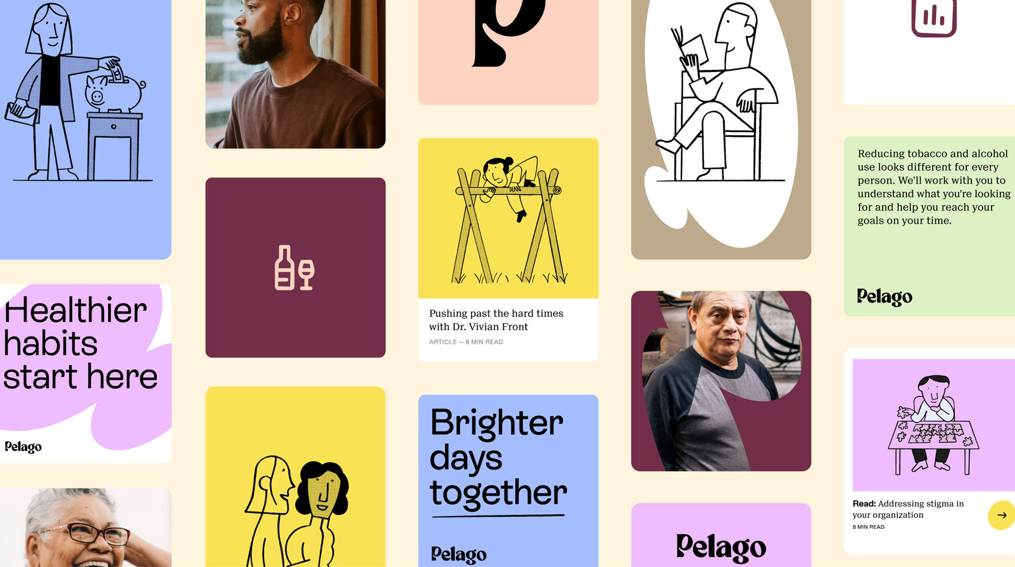 The image presents a grid-based layout featuring soft, muted color blocks and minimalist line art illustrations. The design employs a clean, modern aesthetic with a focus on conveying health, wellness, and support through simple, approachable visuals.